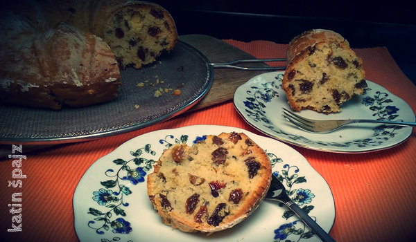 Dodati suvo grožđe i kim, promešati lopaticom i presuti u podmazani kalup za kuglof.
