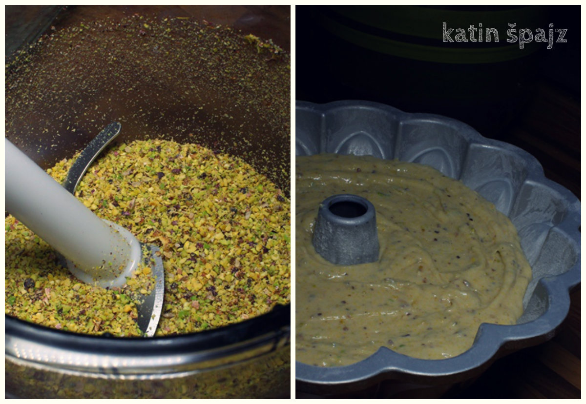 Dodavati sad po etapama - trećinu brašna, pola smese jogurta i palente, po drugu trećinu brašna, ostatak jogurta sa palentom i ostatak brašna. Umešati iseckane pistaće.