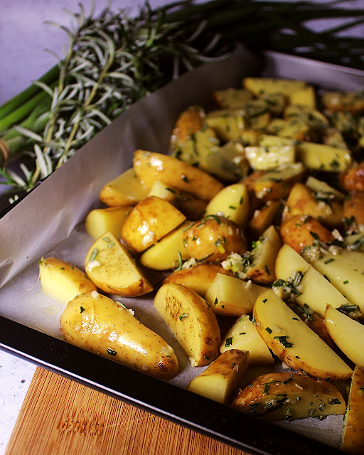 Ovaj je recept veoma jednostavan, već sam kazala. Krompit se poulji, pomeša sa iseckanim belim lukom i ruzmarinom i ispeče u rerni. Za vrsne domaćice, verujem i dosadan čak.
